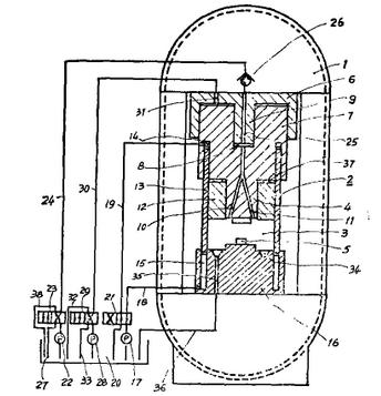 套筒13的上下運(yùn)動,由泵17及閥21來控制。壓力補(bǔ)償室8內(nèi)的油由泵22及閥23;來供給。在通向壓力補(bǔ)償室8的管道上裝有一單向閥26,以防止油從壓力補(bǔ)償室8返流回油箱20.主活塞7時通過泵28和閥29來操縱的。